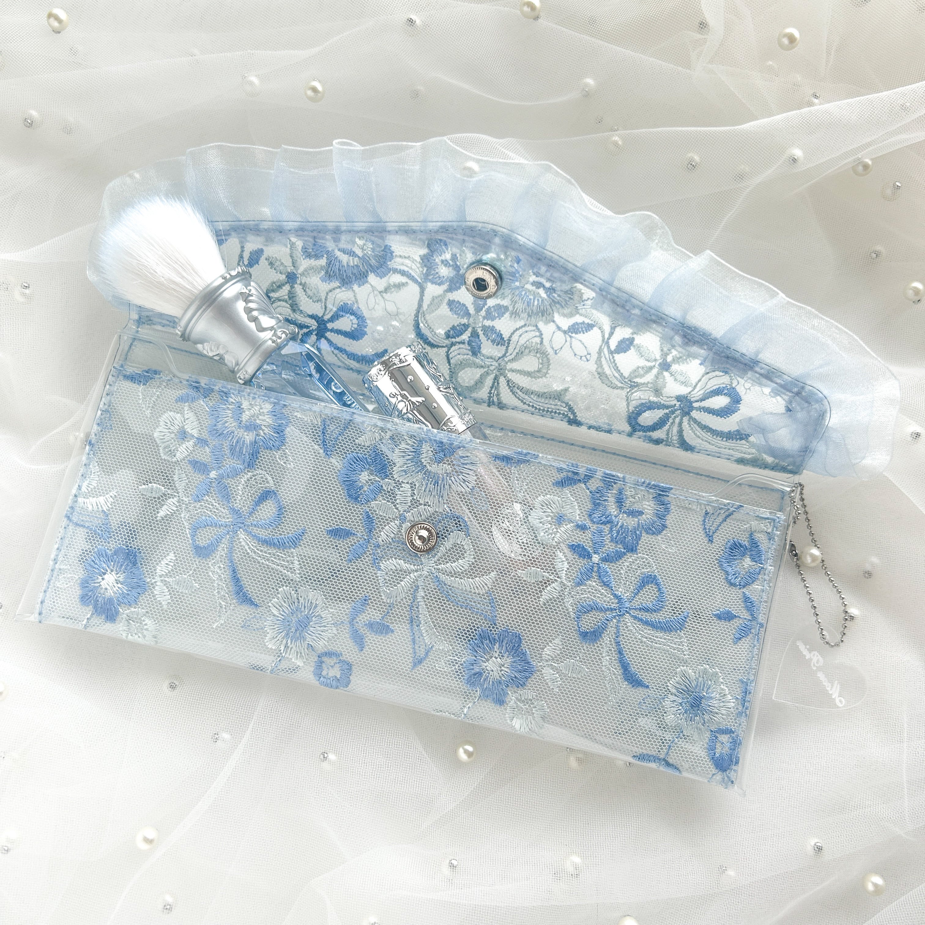 繊細な刺繍生地を使用した、PVC素材のペンケースです。