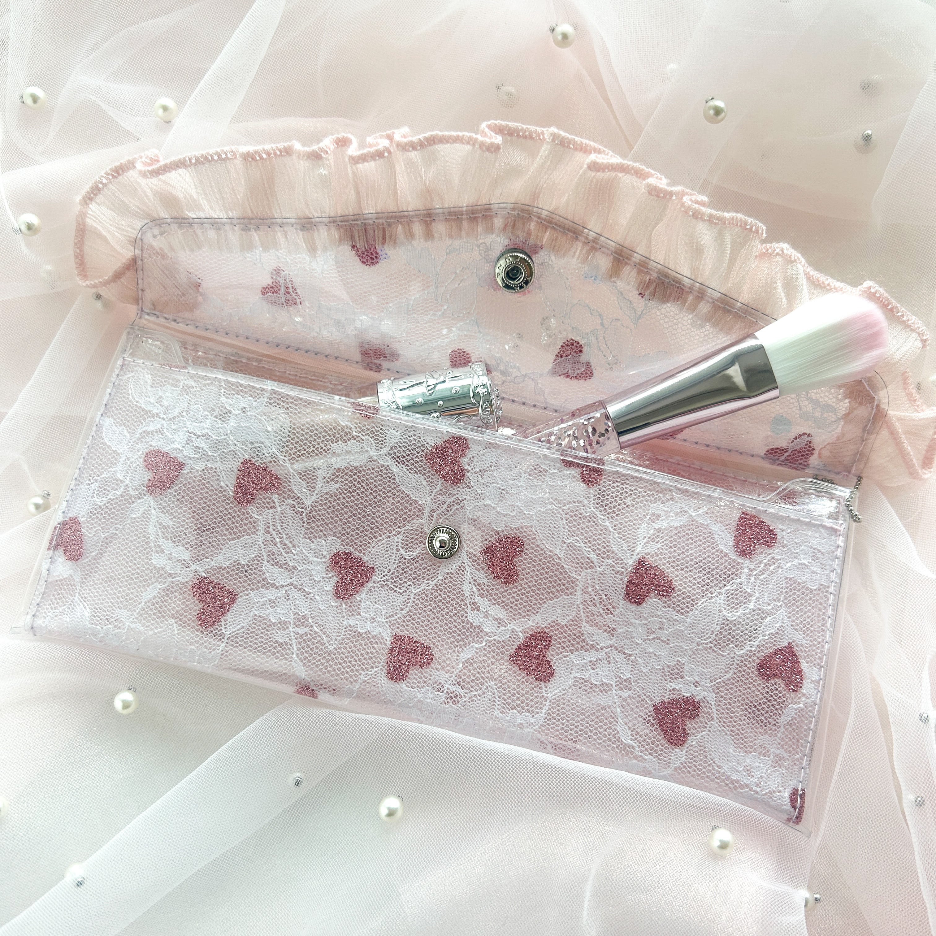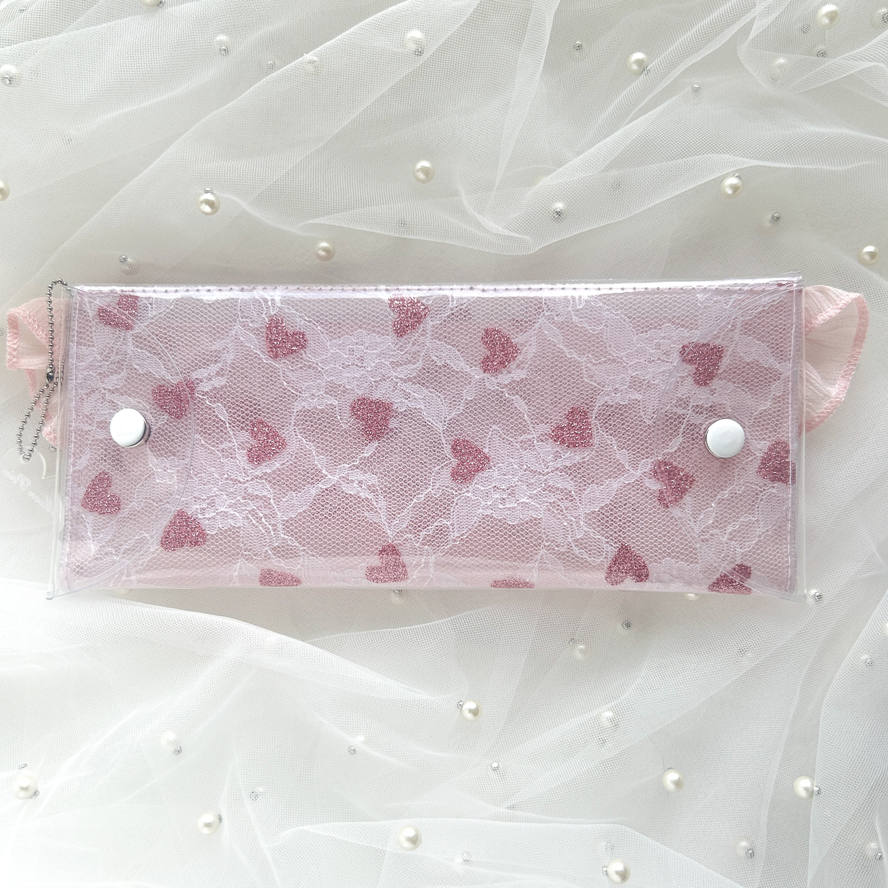 淡いピンクのレース使用した、PVC素材のペンケースです。