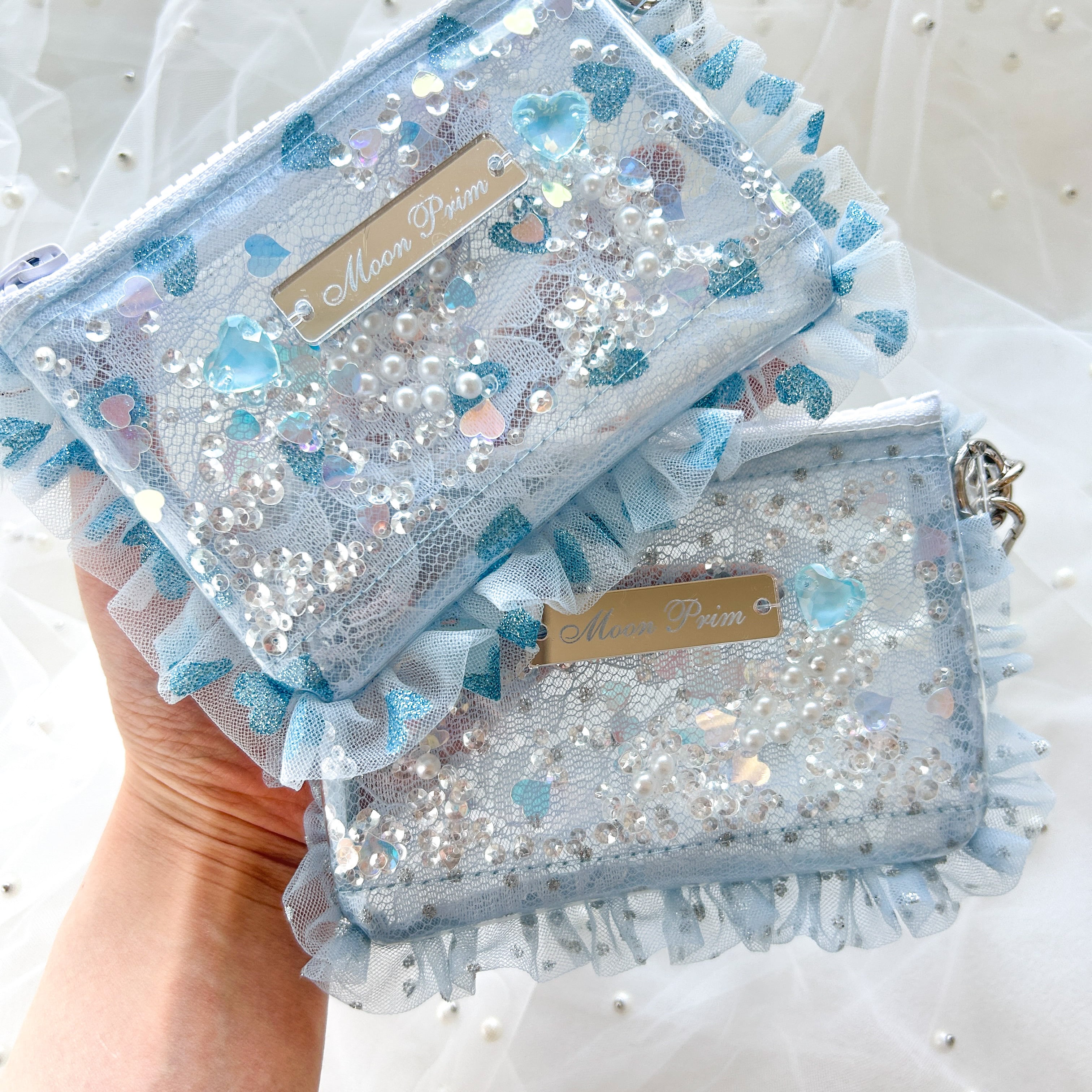 ハートストーンを丁寧に手縫いしたミニポーチ♡